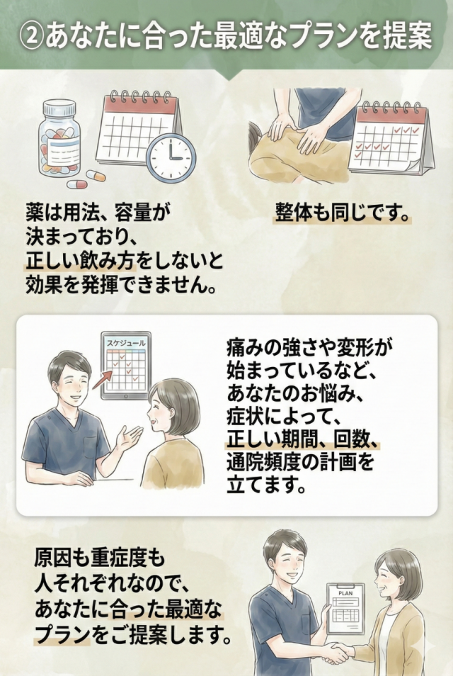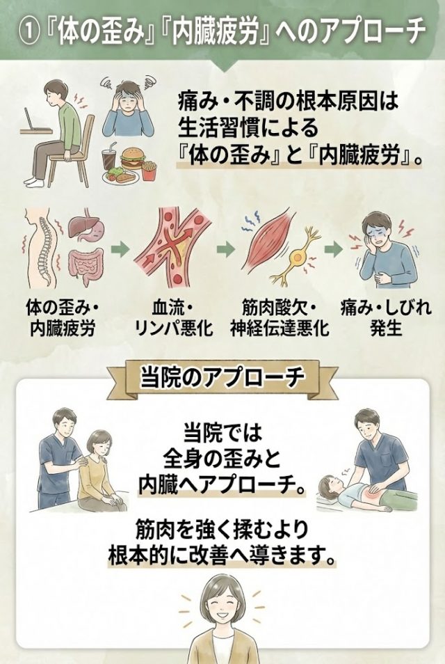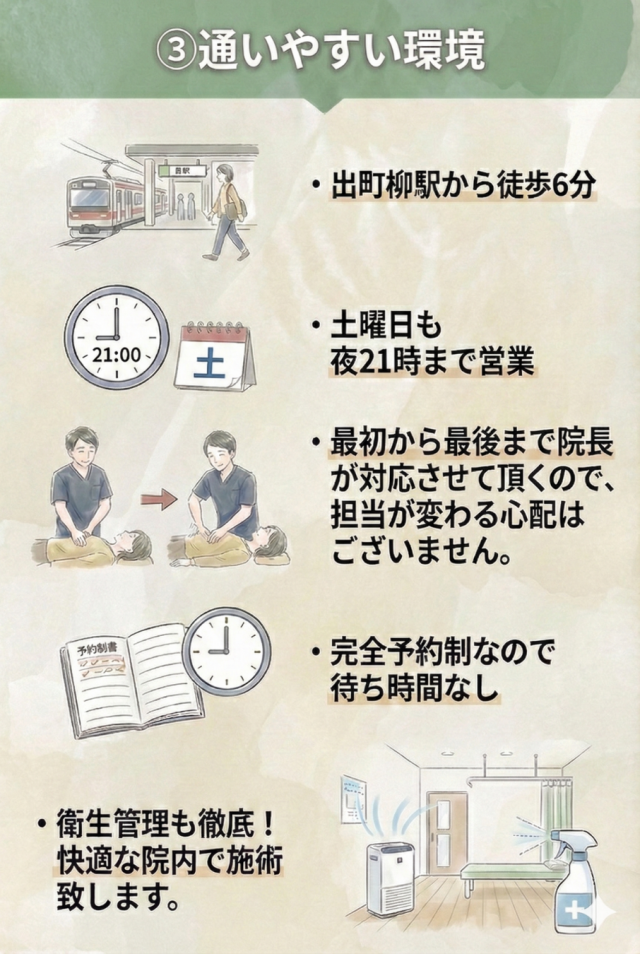 そのため、いつもお世話になってる近くの接骨院で、何度かマッサージを受けました。しかし、根本的に治りそうにないと思い、ネット検索して当院に予約を入れました。