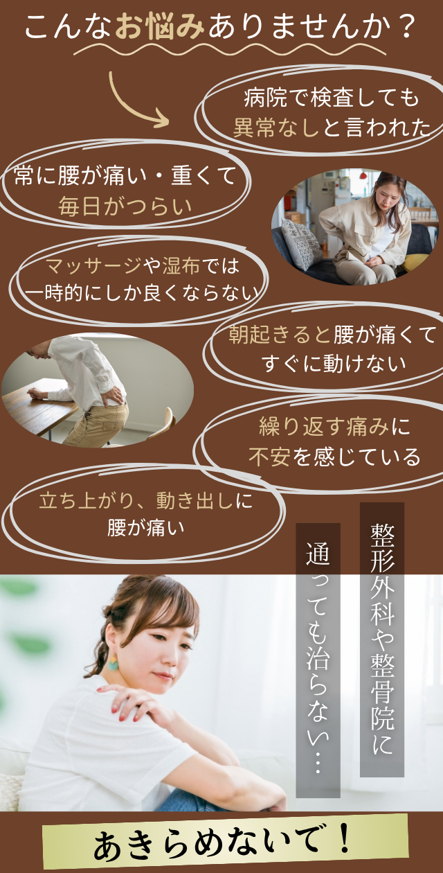 約2ヶ月前から慢性的な腰痛に悩んでいて、整形外科でレントゲン検査では異常なしの診断でシップで我慢していました。